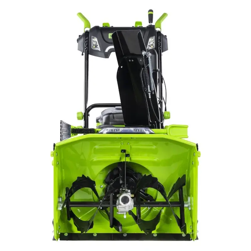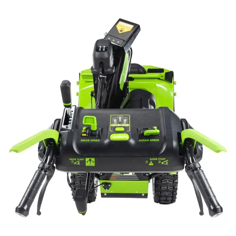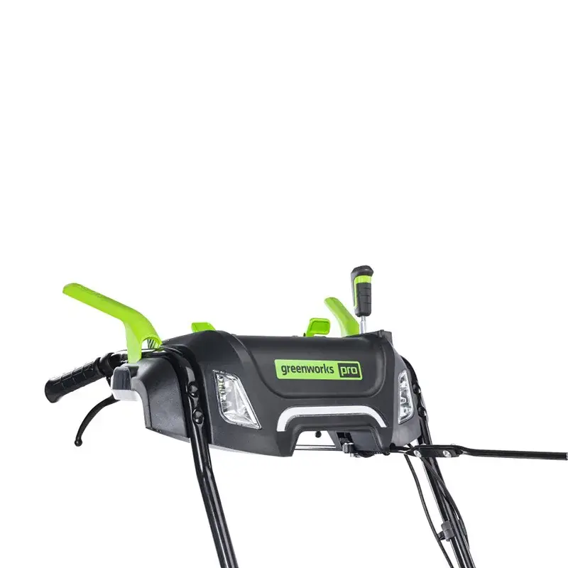 Аккумуляторный снегоуборщик Greenworks движется самостоятельно вперед и назад. При включении заднего хода звучит предупредительный сигнал. На панели оператора расположены все необходимые элементы управления — переключатели скорости движения и вращения шнека, рычаги настройки дальности выброса снега и кнопки включения фар. Разгрузочный желоб можно поворачивать на 200° при помощи удобной рукоятки. Функция разблокировки колес позволяет без усилий разворачивать машину на месте. Прикрепленный к ковшу инструмент «3 в 1» — лопатка, щетка и скребок — помогает удалить засоры, смахнуть снег, очистить снегоуборщик от наледи.