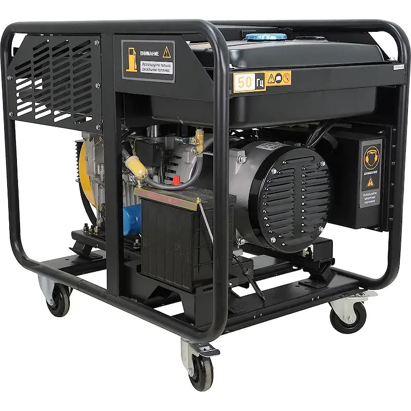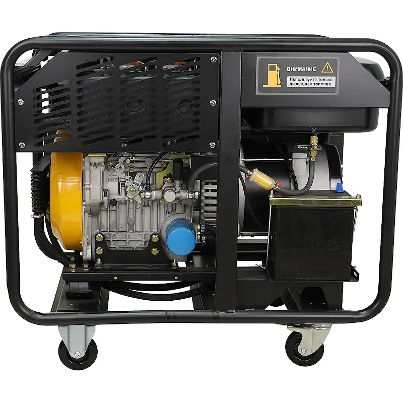 Благодаря наличию колес мини-электростанцию при необходимости можно легко переместить. Класс герметичности IP23 обеспечивает надежную защиту от проникновения пыли и влаги, что позволяет использовать дизель-генератор на улице. Розетки закрыты крышками, предохраняющими от попадания грязи.