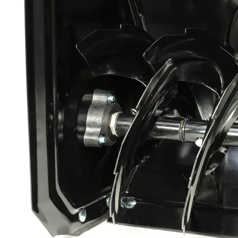 Модель оснащена прочным металлическим шнеком, который позволяет быстро справляться даже с затвердевшими комками снега. Мощный мотор обеспечивает отбрасывание снега на большое расстояние. При этом направление и дальность выброса настраиваются вручную.