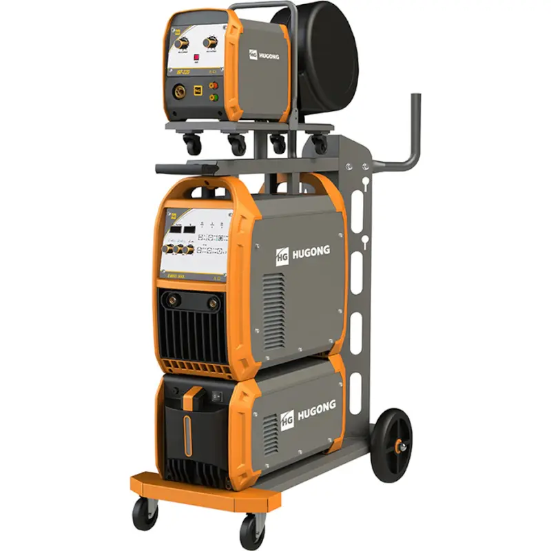 Сварочный полуавтомат Hugong EMIG 500 III – аппарат для работы в режимах MIG/MAG и ММА. Сварочный ток регулируется до максимального показателя 500 А. Модель сделана на базе инверторных транзисторов IGBT. В комплект поставки входят: тележка, система плавной подачи проволоки, блок водяного охлаждения, сварочная горелка HG MIG-501, подающий рукав, кабели, газовый шланг и ролики.