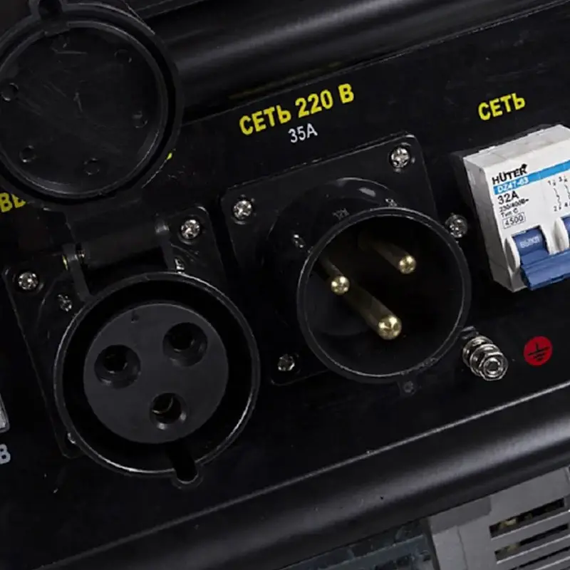 Для подключения бытовых приборов или электроинструмента на корпусе есть 2 розетки 220 В. Защитные колпачки бензогенератора Huter DY6500LXA не позволят проникнут пыли, грязи или влаги внутрь.