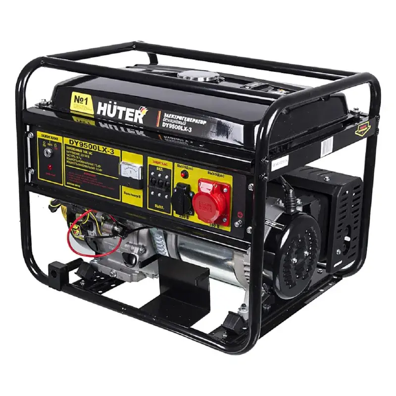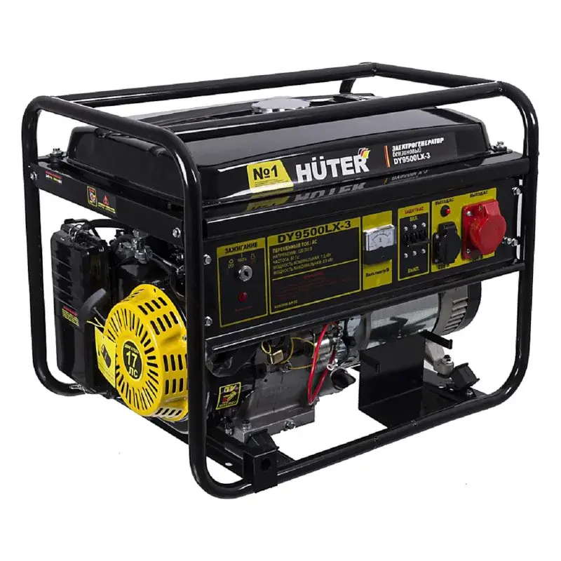 Генератор Huter DY9500LX-3 – это компактный и мощный генератор, который можно использовать в качестве резервного источника электроснабжения в загородном доме, на даче, для питания электричеством уличных торговых точек, при проведении строительных работ, в мастерских и т.д. Генератор Huter DY9500LX-3 работает на неэтилированном бензине марки АИ-92 и оснащен бензобаком на 25 литров.