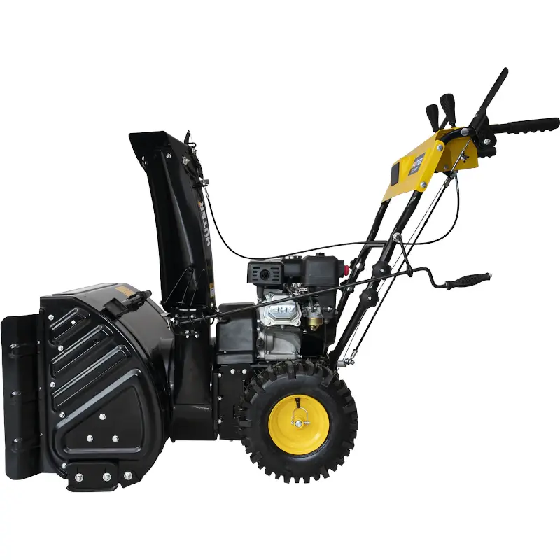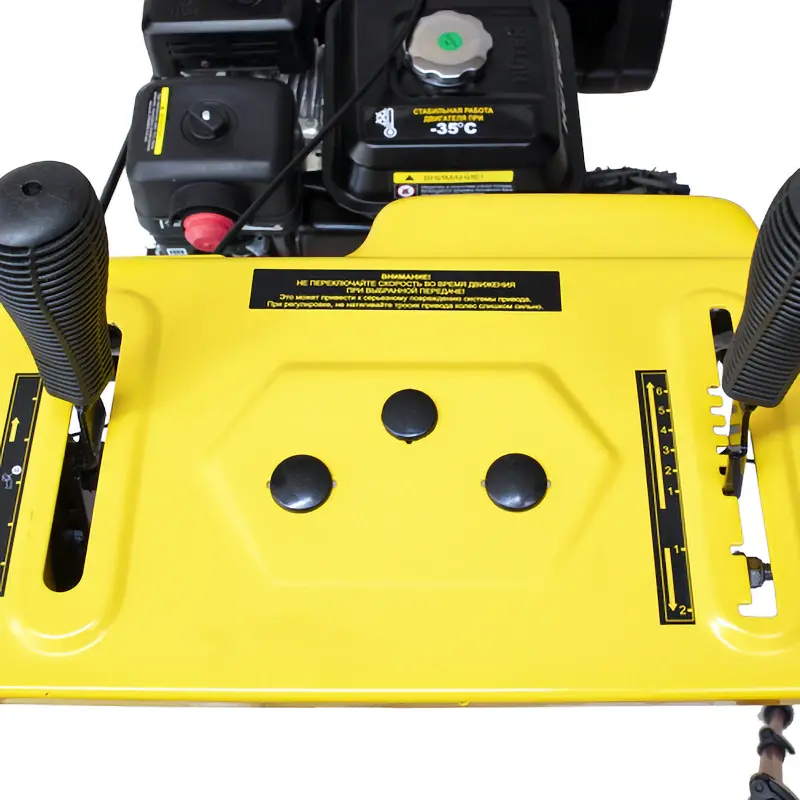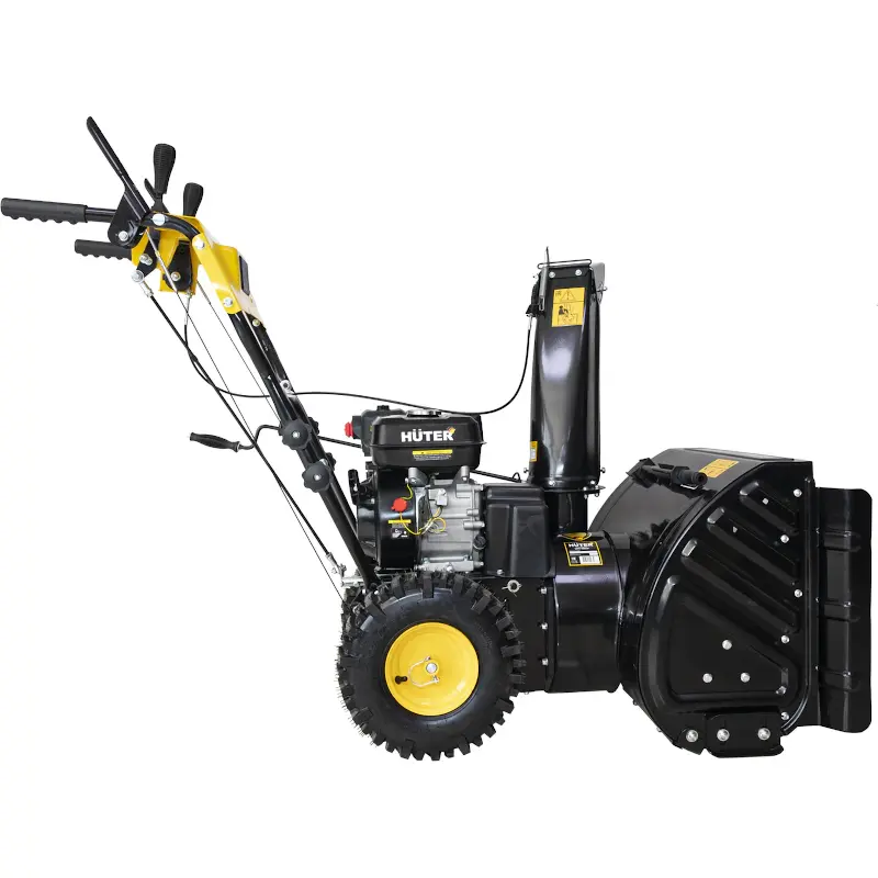 Снегоочиститель оснащен мощным двигателем Huter объемом 244 см3, что обеспечивает его высокую производительность. Максимальная дальность отбрасывания снега составляет 15 м, направление и угол выброса легко регулируются рычагами на панели оператора.