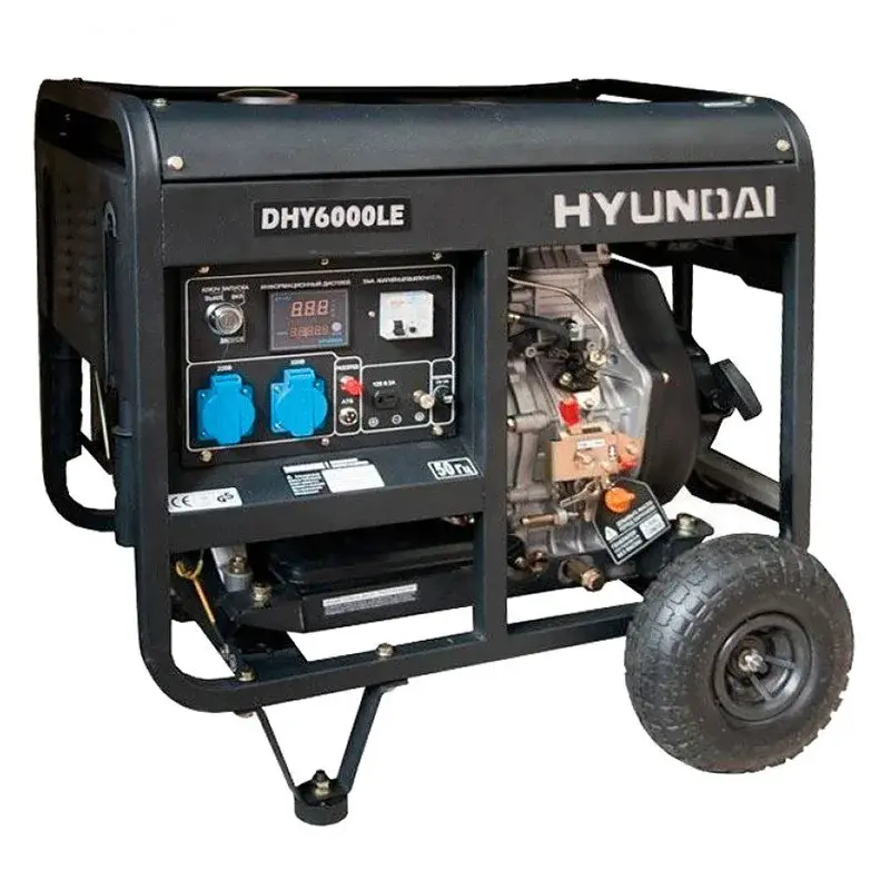 Масса электростанции - 107 кг, чтобы облегчить ее перемещение, в конструкции предусмотрены два транспортировочных колеса. Две силовые розетки на 220 В защищены от пыли пластиковыми крышками с самозакрывающимся механизмом. Электрозапуск дизель-генераторной установки Hyundai DHY 6000LE значительно упрощает заведение двигателя, для начала работы достаточно провернуть замок зажигания.