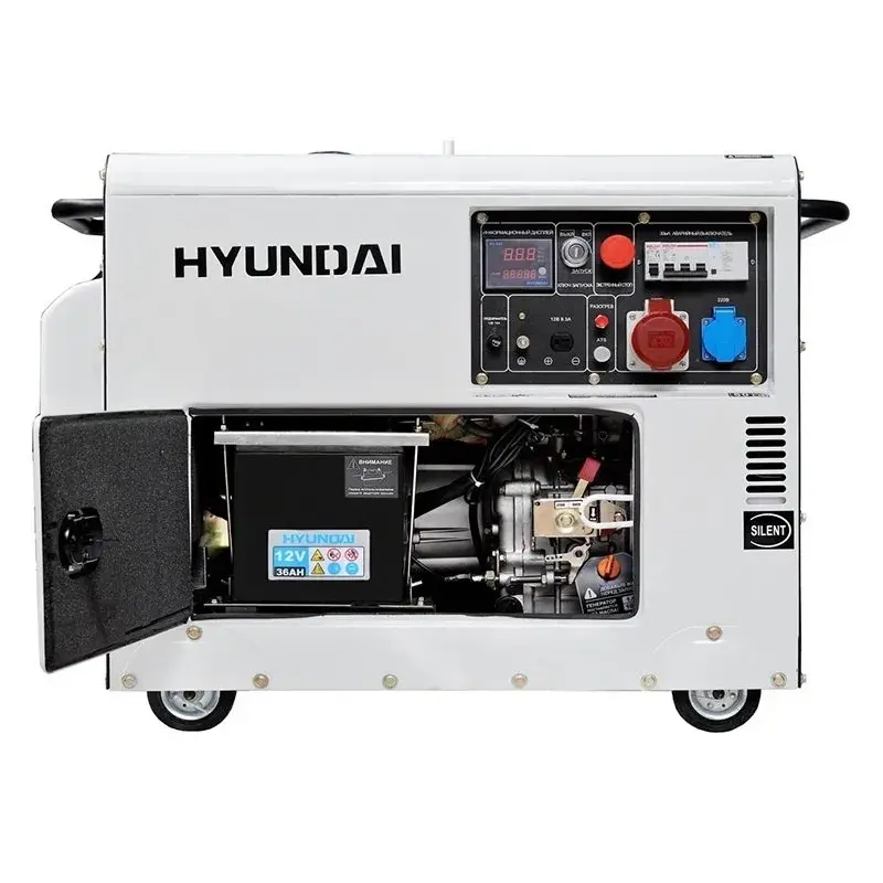 Дизельный генератор Hyundai DHY 6000SE с максимальной мощностью двигателя 5,5 кВт оснащен двумя розетками на 16 А и 32 А для питания однофазных приборов. Автоматическая система EASY START облегчает запуск мотора, для включения электростанции достаточно повернуть замок зажигания.