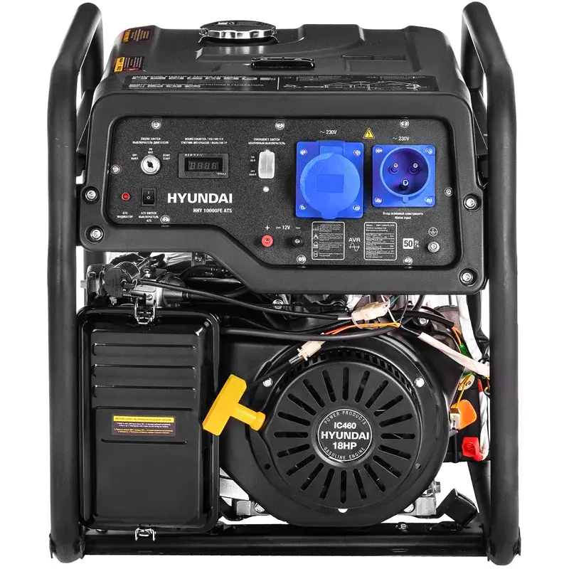 На бензогенераторе Hyundai HHY 10000FE ATS установлен мультифункциональный цифровой дисплей, на котором отображается вольтаж, частота в Гц и количество отработанных моточасов. Информационное табло ресурса двигателя воспроизводится в двух режимах, показывая либо время с последнего включения, либо за весь период эксплуатации.