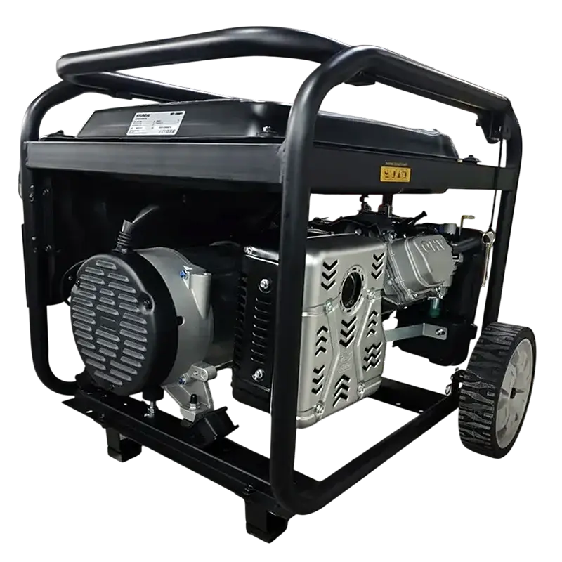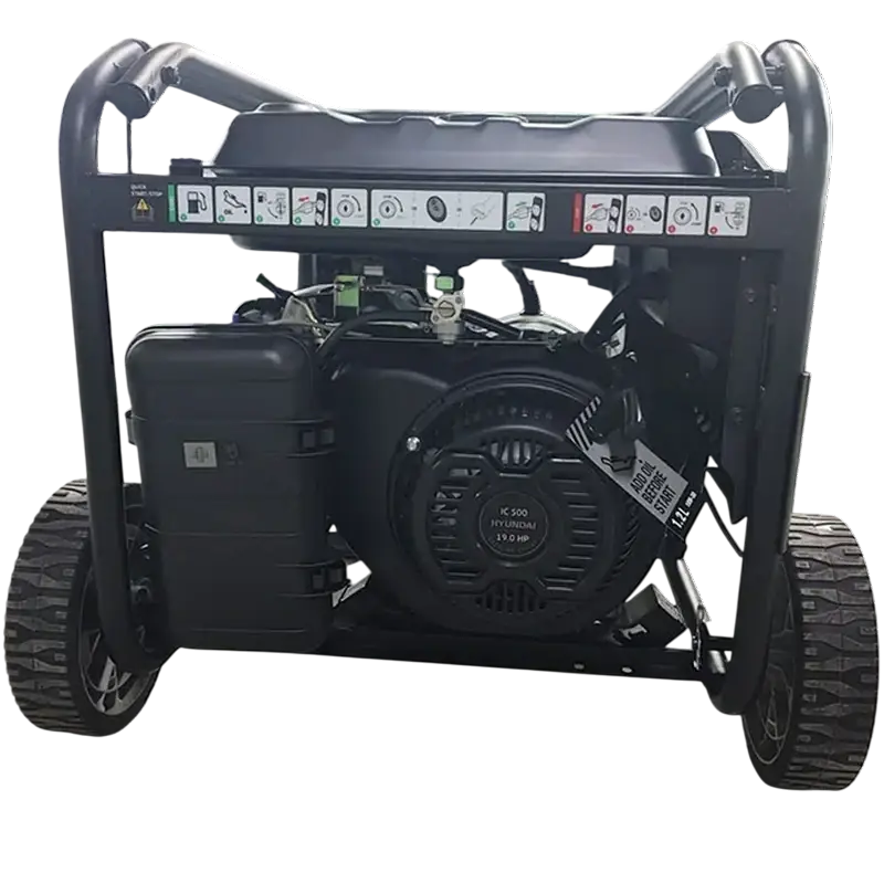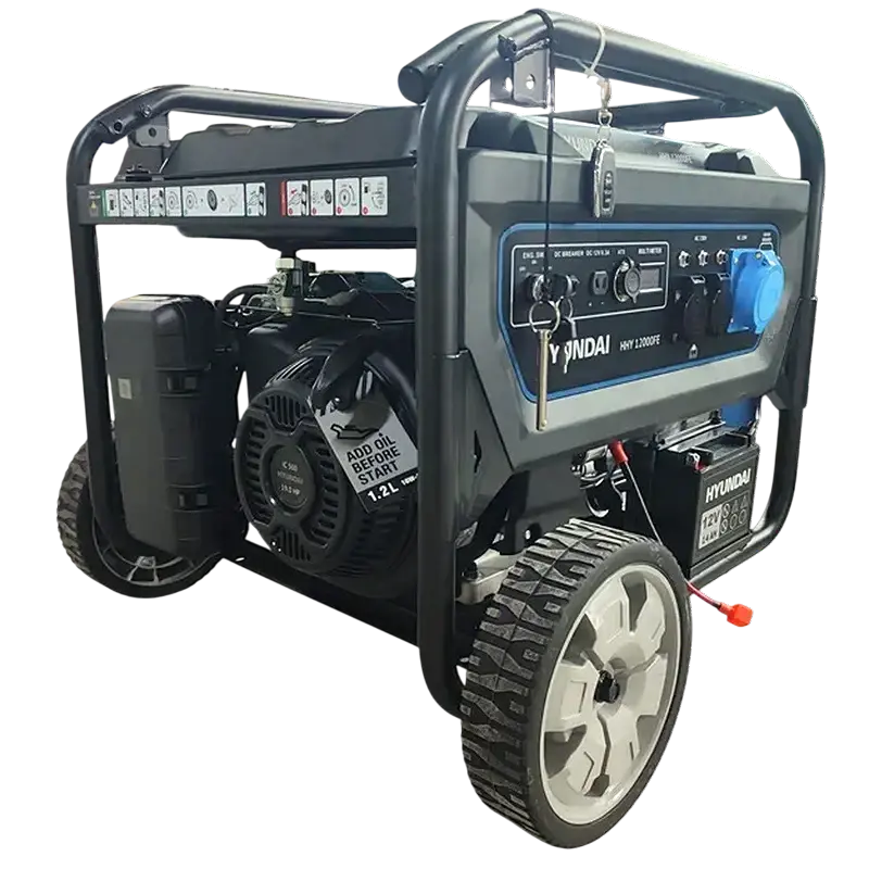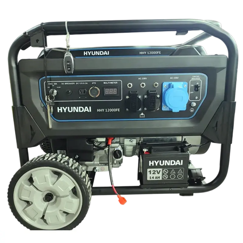 Бензиновый генератор HYUNDAI HHY 12000 FE с максимальной мощностью на выходе до 9,5 кВт переменного тока, напряжения 220 Вольт. Бензогенератор с AVR (автоматический регулятор напряжения). Есть функция электрозапуска с ключа и пульта, от установленного в конструкцию аккумулятора. Время работы на одной заправке при половинчатой нагрузке - до 14 часов. Купить бензогенератор HYUNDAI HHY 12000 FE рекомендуем владельцам загородных домов в качестве резервного источника питания на случай внезапного отключения сетевого электроснабжения. Также бензиновый генератор будет незаменим на строительных объектах в качестве локального источника электроэнергии.