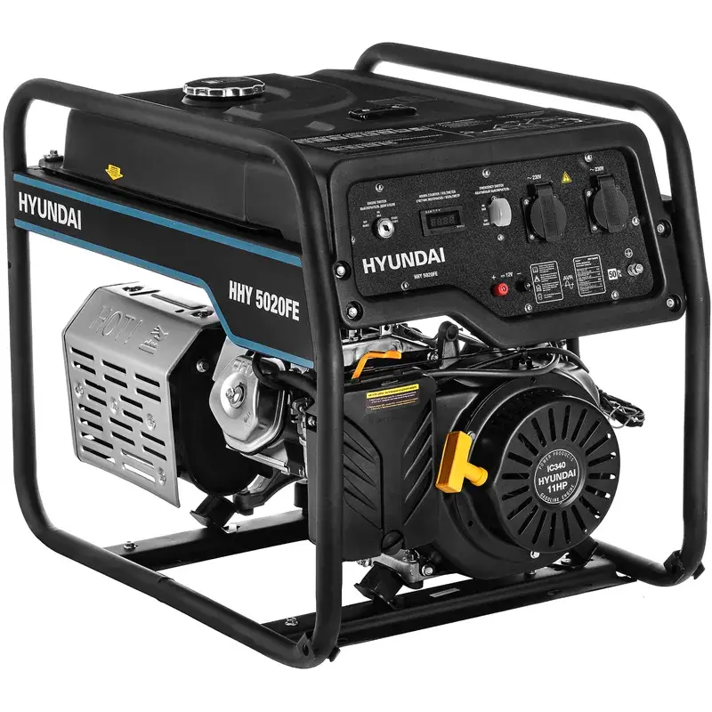 Бензиновый генератор Hyundai HHY 5020FE оснащен электрическим стартером для быстрого запуска двигателя. Выходной мощности 11 л. с. достаточно для подключения оборудования с высокими пусковыми токами и общей нагрузкой до 4,5 кВт.