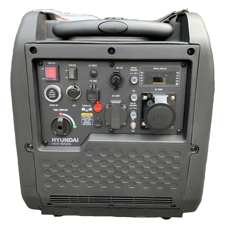 Инверторный генератор Hyundai HHY 9050Si предназначен для питания однофазных потребителей суммарной мощностью до 6 кВт. В модели предусмотрен регулятор напряжения AVR, электростартер и ECO-режим. В комплекте поставляются колеса, которые крепятся на корпус для простого перемещения генератора по помещению т.к. его нельзя поднимать за переднюю панель.