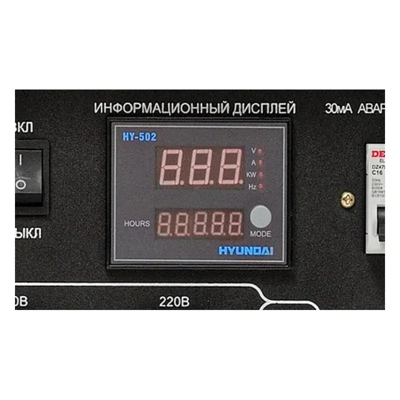 В бензиновом электрогенераторе Hyundai HY 7000SE-3 все обозначения панели управления просты и ясны. Это позволяет с лёгкостью разобраться с функционалом. Светодиодный дисплей даёт возможность наблюдать за показателями тока по 4-м основным величинам: напряжение, сила тока, потребляемая мощность, частота. В комплекте с генератором поставляются аксессуары зарядки и выработки переменного и постоянного тока.