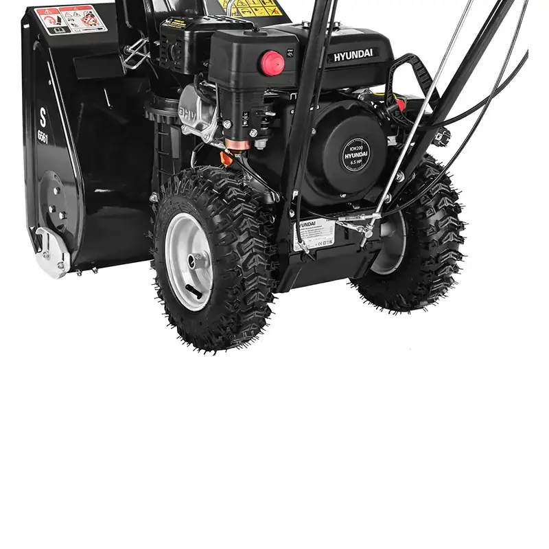 Подогрев карбюратора в снегоочистителе Hyundai S 6561 исключает обледенение деталей. За счет этого мотор легче запускать при минусовых температурах до - 30 °C. Также предусмотрена подкачка топлива кнопкой, что влияет на простоту включения. Помимо этого, в снегоочистителе предусмотрен контроль над дроссельной заслонкой задней части двигателя. Перед запуском необходимо выбрать положение закрыто, которое обозначается надписью - “Choke”. Управление заслонкой будет полезным, если мотор быстро глохнет.