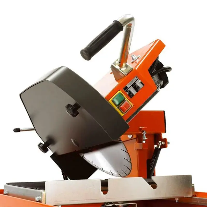 Электрический плиткорез работает от сети с напряжением 230 В, оснащен асинхронным двигателем мощностью 2200 Вт и самовсасывающим насосом. Вода распыляется на диск сразу после запуска мотора, обеспечивая охлаждение контактирующих частей и снижая содержание пыли в воздухе. Изменение глубины резки и наклона пильной головы выполняется при помощи рычагов и рукояток, без применения дополнительных инструментов. За счет съемной поворотной направляющей вы можете производить обработку в нескольких положениях от 45_ до 90_.