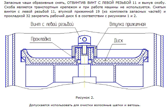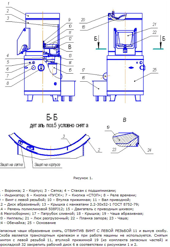 Процесс очистки состоит в механическом воздействии на продукт рабочих органов (чаши абразивной и внутренней камеры с отверстиями) и воды. Мезга удаляется через отверстия на дне машины по сливному шлангу в канализацию напрямую или через мезгосборник.