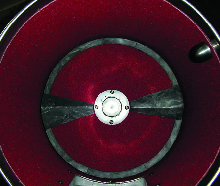 В картофелечистке облицовка, терочный диск, загрузочный лоток и крышка выполнены из нержавеющей стали. На внутренней поверхности обечайки и на поверхности терочного диска установлены сменные долговечные экологически чистые абразивные полотна. Выгрузка очищенного картофеля осуществляется через лоток при вращающемся абразивном диске.