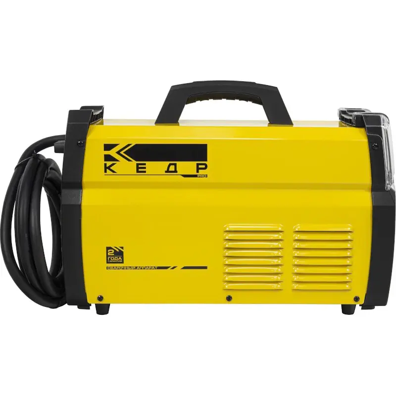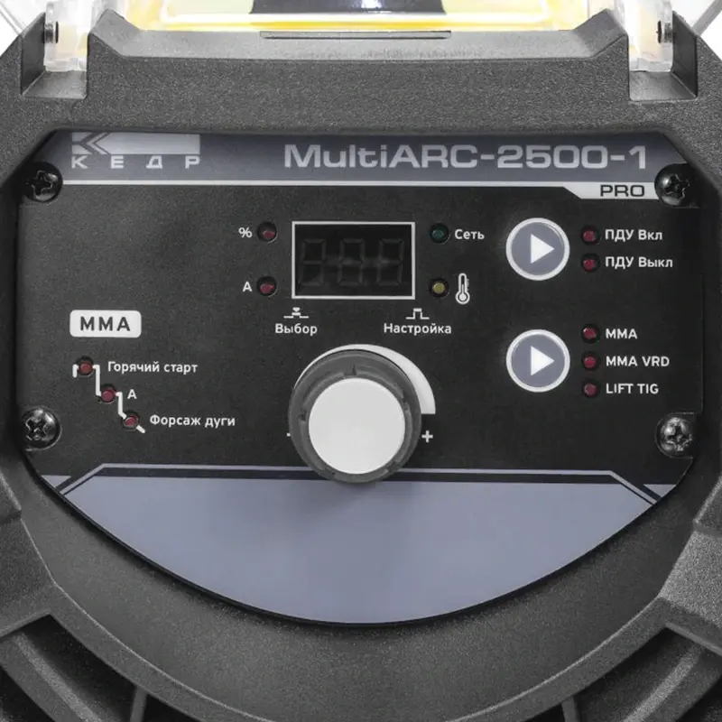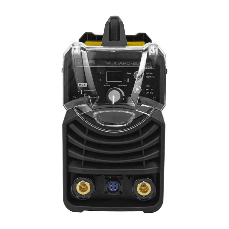 Передняя панель управления закрыта прозрачным пластиковым экраном с целью защиты от пыли и случайных ударов. Компактный и легкий сварочный аппарат КЕДР MultiARC 2500 1 удобно переносить между рабочими объектами за прочную верхнюю ручку.