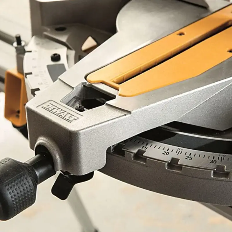 Торцовочная пила DeWALT D27113 весит всего 19,5 кг. За счет этого его легко переносить по рабочему помещению. Для удобства на корпусе размещены выступы для рук.