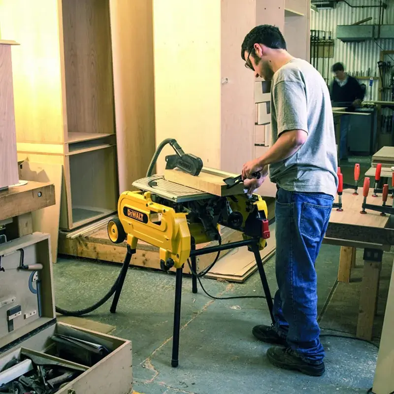 Ножки торцовочной пилы DeWALT D27107 отсоединяются, а верхняя часть с режущей головкой компактно складывается. В таком виде инструмент не займет много пространства во время хранения. А за счет двух транспортировочным колес и длинной рукоятки вы можете с легкостью перемещать модель по рабочему помещению.