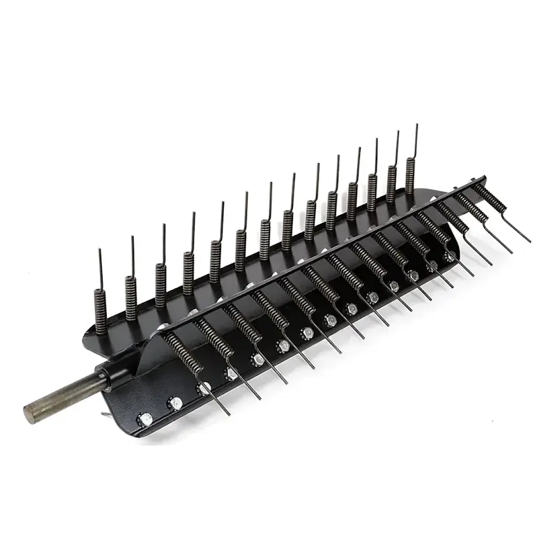 - Рабочий орган с 52 пружинными зубьями эффективно и аккуратно удаляет мох и солому с поверхности чувствительных газонов, требующих бережного обслуживания. Возможна быстрая замена отдельных подпружиненных трубок без снятия барабана.