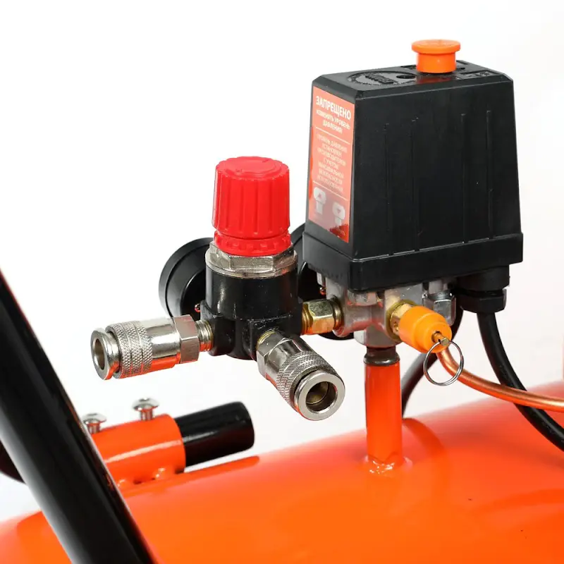 Прессостат автоматически отключает двигатель при давлении в ресивере 10 бар. При расходовании воздуха пневмоинструментом давление снижается и прессостат включает двигатель. Вы можете регулировать давление на выходе в диапазоне от 1 до 10 бар в зависимости от подсоединенного инструмента. Рабочие параметры удобно отслеживать с помощью двух манометров.