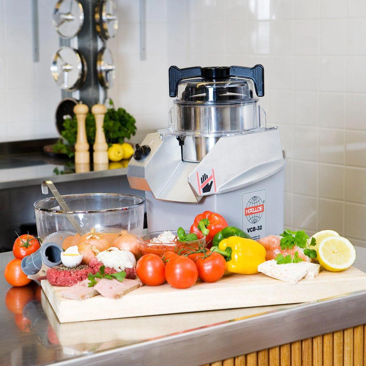 Куттер Hallde VCB-32 предназначен для переработки влагосодержащих, сухих и жидких пищевых продуктов: измельчение, мелкая нарезка и перемешивание практического любого типа продукта - от овощей до орехов, приготовление ароматизированных масел, майонеза, десертов, фарша, пюре, паштетов, панировочных сухарей и т.п. Модель VCB-32 подходит для кухонь детских садов, домохозяйств, армейских столовых, морских судов, ресторанов, отелей, предприятий общественного питания, пекарен, кафе/баров, супермаркетов и т.д.