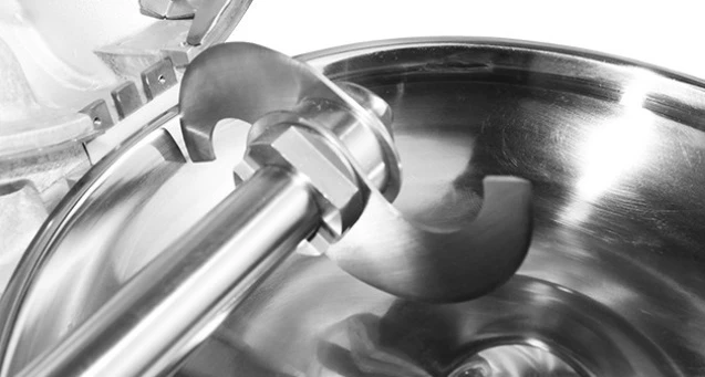 Продукт загружается в чашу из нержавеющей стали, вращающуюся в горизонтальной плоскости перпендикулярно плоскости вращения 2-х лопастного серповидного ножа.