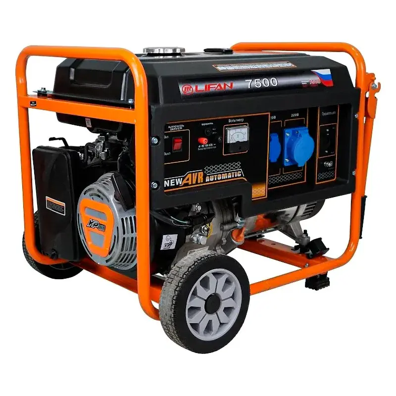 LIFAN 7GF-6 (7500) - мощный однофазный бензиновый генератор, применяемый в качества источника электроэнергии на дорожных и строительных работах, промышленных объектах, на личных загородных участках, в автомастерских, магазинах и в других подобных областях. Исключительная надежность, устойчивость к поломкам и высочайшая производительность делают данную модель одной из лучших на рынке в своем классе электрогенераторов.