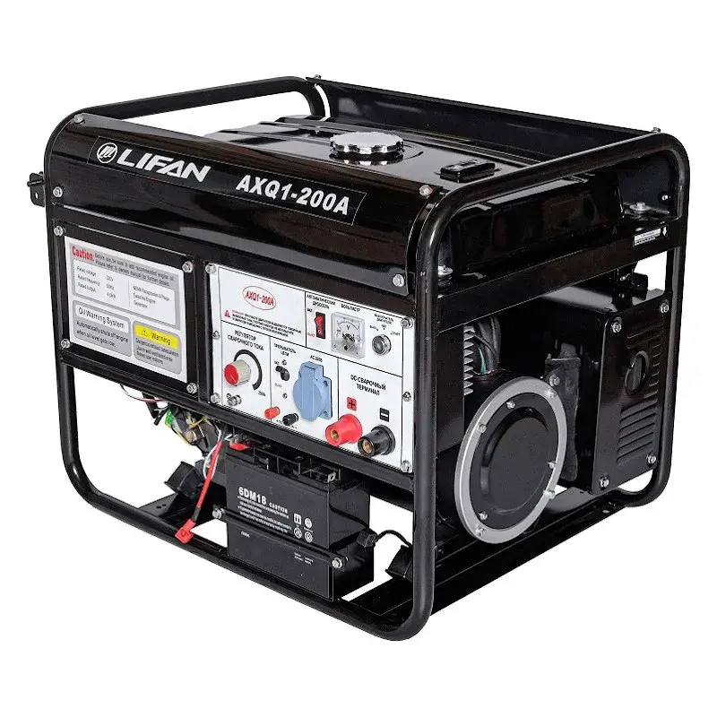 LIFAN AXQ1-200A - однофазный бензиновый генератор мощностью 4/4,5 кВт, предназначенный для ручной дуговой сварки (MMA), а также питания различных электроприборов. Продолжительность включения (ПВ) в режиме MMA составляет 80% при работе на сварочном токе 160 А и 50% на сварочном токе 200 А.