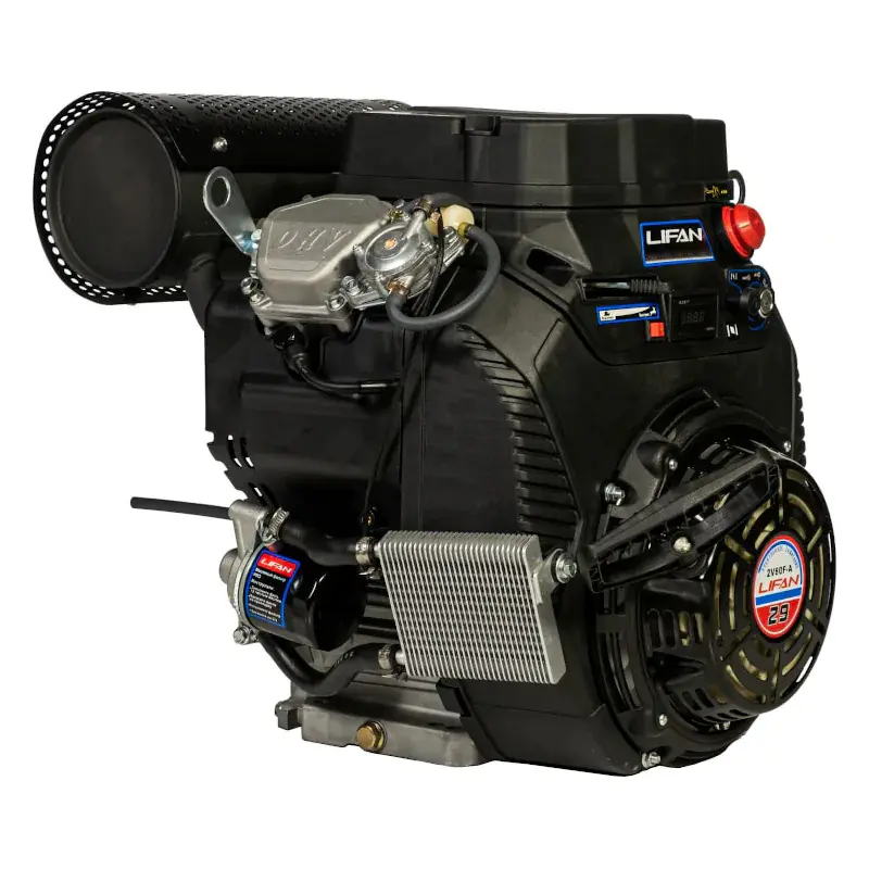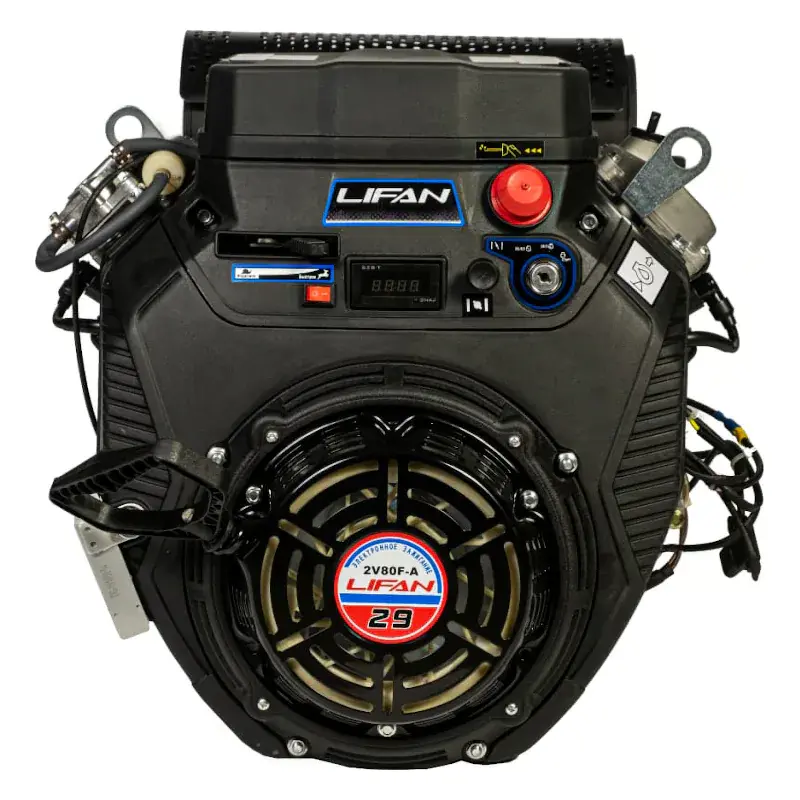 Двигатель LIFAN LF2V80F-A, 29 л.с. D25, 3А разработан специально для использования совместно с картингами, вездеходами, мотобуксировщиками, минитракторами, снегоходами, багги. Тип двигателя: бензиновый, 4-хтактный, двухцилиндровый, с воздушным охлаждением. Оснащен датчиком давления масла. Степень сжатия: 8.5 : 1. Вращение вала против часовой стрелки.