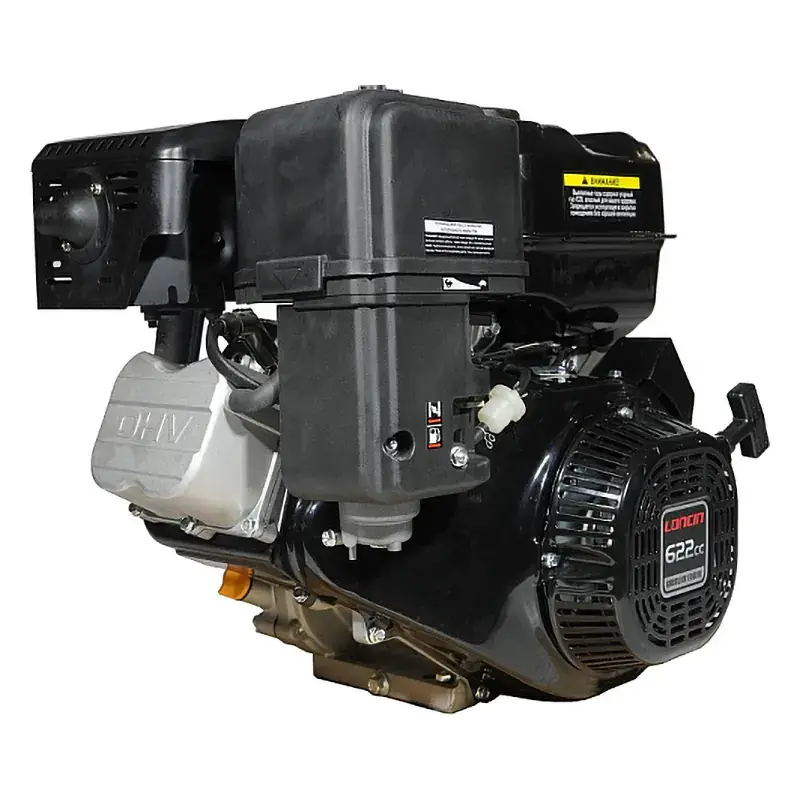 Одноцилиндровый двигатель, объем 622 куб.см, 23 л.с, горизонтальный вал 25 мм, ручной и электрический запуск, катушка освещения 20А.