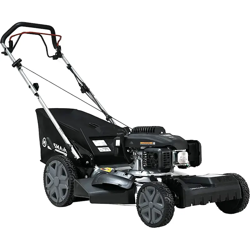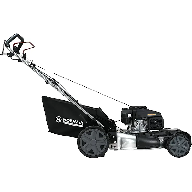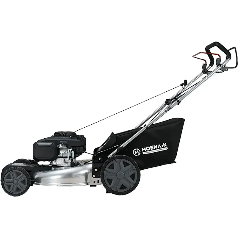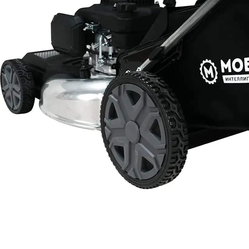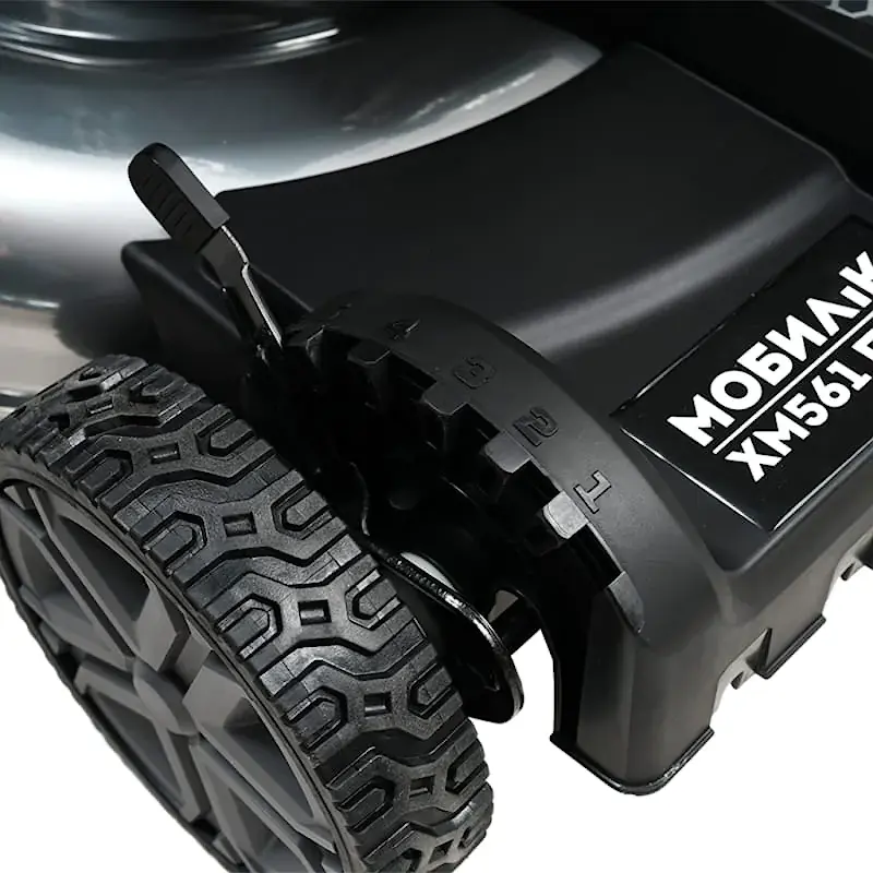 Самоходный тип перемещения газонокосилки Мобил К XM561 Про значительно облегчает стрижку травы. Вам не понадобится толкать технику по участку. Это облегчает маневрирование и разворот модели. Скорость движения составляет 3,4 км/ч. Вам понадобится только задавать направление при помощи рукоятки. Колеса оснащены подшипниками для плавного хода. Для лучшей проходимости задние колеса больше передних.