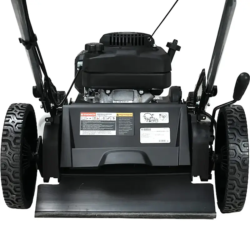 На корпусе бензиновой газонокосилки находится штуцер для подключения садового водопроводного шланга. За счет этого вы сможете быстро промыть деку.