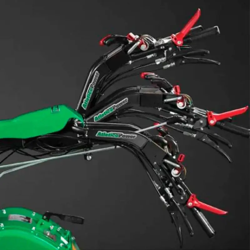 Бензиновый мотоблок Caiman Atletico 338P – многофункциональный двухколесный трактор с профессиональным бензиновым двигателем Honda мощностью 8,4 л.с., реверсивной рукояткой управления, гидравлическим сцеплением PowerSafe®, блокировкой дифференциала, шириной обработки почвы до 80 см (в зависимости от выбора навесного приспособления).