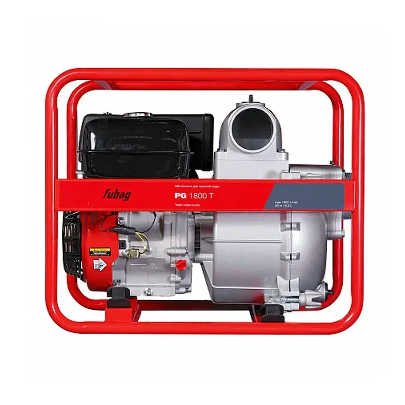 Мотопомпа для сильнозагрязненной воды Fubag PG 1800 T предназначена для откачки грязной воды из подвалов и строительных котлованов, работ в сельском хозяйстве, ликвидации последствий паводков и половодий. Мощный насос перекачивает сильнозагрязненную воду с примесями абразивных частиц до 25 мм. Максимальная высота всасывания равна 8 м, высота напора — 26 м. Производительность мотопомпы составляет 1800 л/мин.