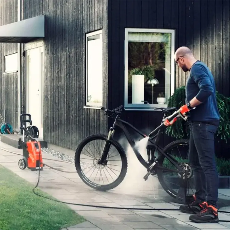 Полупрофессиональную мойку легко транспортировать с помощью телескопической алюминиевой рукоятки. Держатель компактно складывается, чтобы при хранении агрегат не занимал много пространства. Помимо этого, в минимойке Husqvarna PW 480 также предусмотрена и дополнительная рукоятка. Она находится в самом низу возле колес.