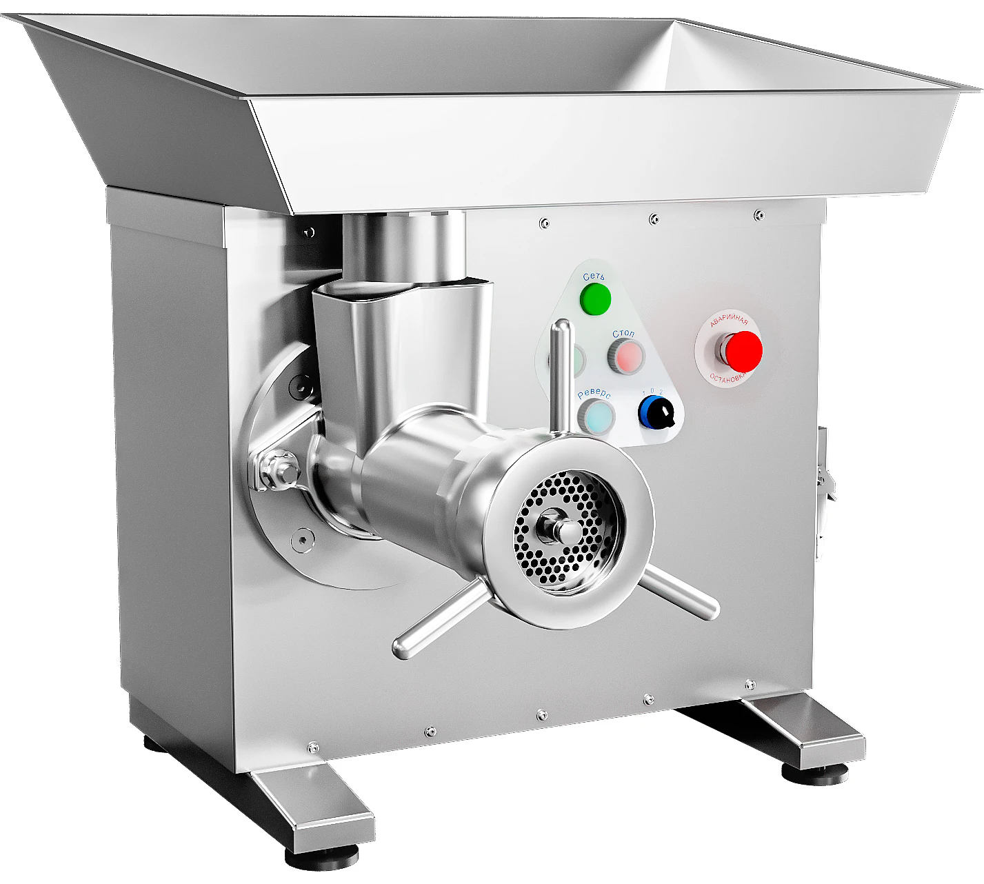 Мясорубка Abat МЭП-600 с системой ножей Unger предназначена для измельчения мяса и рыбы на фарш, повторного измельчения котлетной массы и набивки колбас на предприятиях общественного питания.