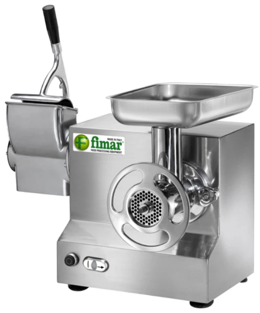 Мясорубка-терка Fimar 22/AT с системой ножей Enterprise надежное профессиональное оборудование, способное переработать в фарш до 300 килограмм мяса или рыбы за час. Производительность терки составляет 40 килограмм за час. Терку можно использовать для предварительного измельчения продукта, чтобы потом быстрее и легче переработать его в фарш. Эту мясорубку можно также использовать для набивки колбас, протирки овощей. В таком случае вам понадобится просто приобрести соответствующие насадки.
