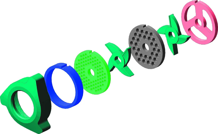 Мясо, предварительно разрезанное на куски весом до 200 г, толкателем из чаши подается в горловину насадки-мясорубки. Вращающийся шнек захватывает мясо и с помощью имеющихся на внутренней полости корпуса спиральных ребер подает его к ножам. Подрезная решетка надрезает мясо, а вращающийся двусторонний нож разрезает его на более мелкие части. Далее мясо продавливается через ножевую решетку, разрезается вторым двусторонним ножом и продавливается через вторую ножевую решетку.
