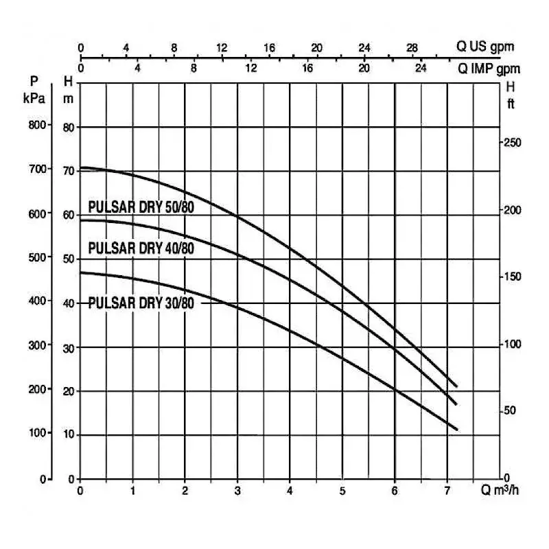 Насос PULSAR DRY 40/80 T-NA разработано специально для индивидуальных и коллективных систем водоснабжения. Рабочий диапазон: производительность – от 0,9 до 7,2 куб.м/ч, напор – до 82 м. водяного столба. Максимальное рабочее давление: максимальная глубина погружения – 20 м. Перекачиваемая жидкость. Состав: чистая, без твердых включений и минеральных масел, не вязкая, химически нейтральная, по характеристикам аналогичная воде. Максимальное содержание песка в воде – 50 г/куб.м. Температура – от 0°С до +40°С. Основные материалы. Рабочие колеса и диффузоры – из технополимера; внешний кожух, кожух двигателя, основание насоса со всасывающим патрубком, вал и крепежные элементы – из нержавеющей стали. Торцевые уплотнения масляной камеры: со стороны гидравлической части – карбид кремния/карбид кремния, со стороны двигателя – графит/керамика. Особенности: Многоступенчатый колодезный насос. Уплотнение вала – масляная камера с двумя торцевыми уплотнениями. Однофазные модели укомплектованы встроенным конденсатором и тепловым выключателем с автоматическим перезапуском. Для трехфазных моделей требуется внешняя защита от перегрузки. Все модели оборудованы всасывающим патрубком. Монтаж. Вал двигателя – в вертикальном положении. Возможен вариант "сухой" установки. При продолжительной работе насос может находиться в не полностью погруженном положении. Комплект поставки: насос в сборе с кабелем 20 м. Стандартное электропитание: 1x230 В, 3x400 В. Степень защиты: IP 68. Класс изоляции: F.