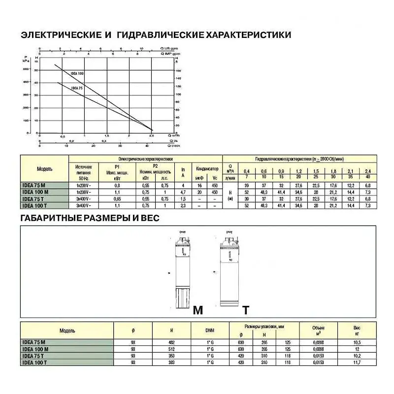 Насос IDEA 100 T разработан специально для индивидуальных и коллективных систем водоснабжения. Для скважин диаметром 4" и более. Рабочий диапазон: производительность – от 0,4 до 2,4 куб.м/ч, напор – до 52 м. водяного столба. Максимальное рабочее давление: максимальная глубина погружения – 20 м. Перекачиваемая жидкость. Состав: чистая, без твердых включений и минеральных масел, не вязкая, химически нейтральная, по характеристикам аналогичная воде. Температура: от 0°С до +35°С. Основные материалы. Гидравлический корпус и основание двигателя – из чугуна; рабочее колесо – из бронзы; кожух двигателя, вал и крепежные элементы – из нержавеющей стали. Особенности. Гидравлическая часть содержит одно рабочее колесо "вихревого" типа. Двигатели однофазных моделей оборудованы встроенным конденсатором. Для трехфазных двигателей требуется внешняя защита от перегрузки. Монтаж. Вал двигателя – в вертикальном положении. Комплект поставки: насос в сборе с кабелем длиной 15 м и нейлоновым тросом длиной 15 м. Стандартное электропитание: 1x230 В, 3x400 В. Степень защиты: IP 68. Класс изоляции: F.
