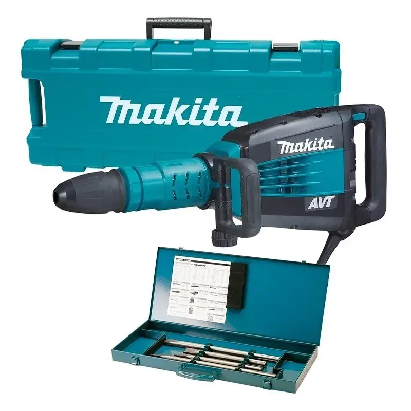 Антивибрационная система AVT состоит из противовеса и амортизаторов. Основная рукоять также закреплена на специальные опоры, которые компенсируют колебания. Такая система снижает вибрации, делая даже продолжительную работу с бетоноломом Makita HM1214C не утомительной.