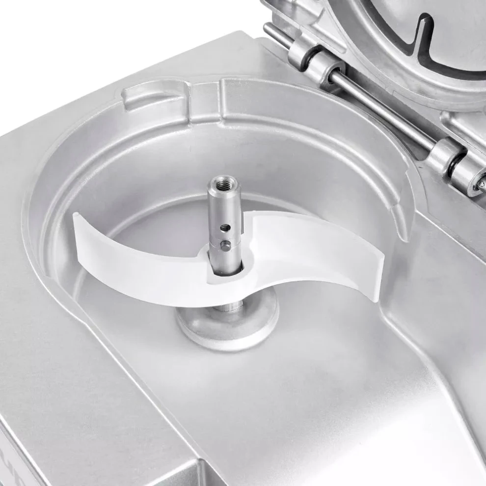 • Автоматической воронкой, сочетающей высокую производительность с качеством нарезки. Для работы с большей загрузкой и скоростью. Подходит для нарезки нежных продуктов, таких как грибы или томаты, а также для терки моркови и нарезания соломкой, кубиками и брусочками фри.