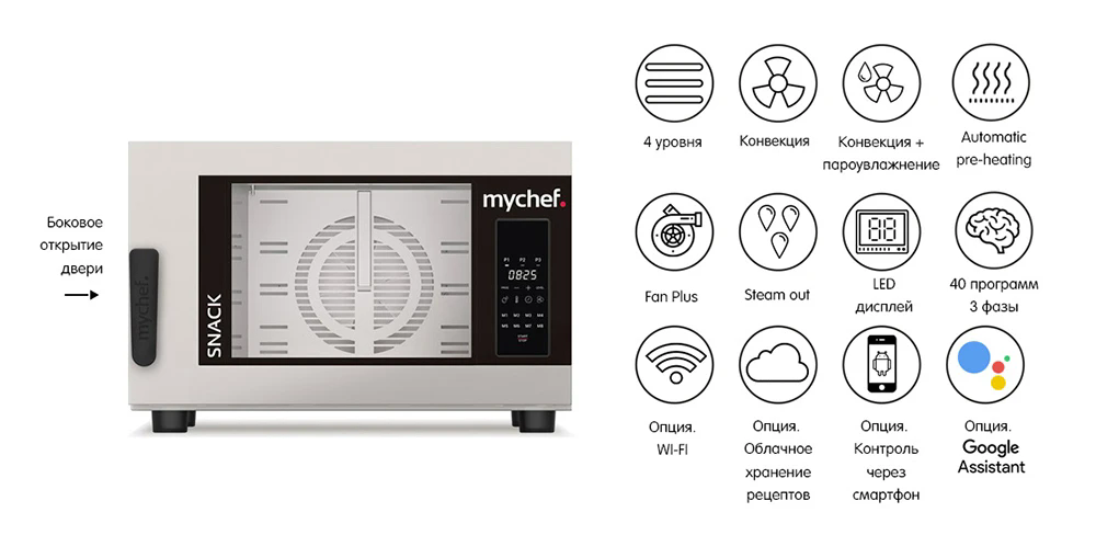 Пароконвектомат Distform Mychef Snack 4 GN 1/1, right opening позволяет тушить, запекать, жарить, готовить на пару, по технологи Sous vide, сушить, размораживать, коптить на предприятиях общественного питания и торговли.