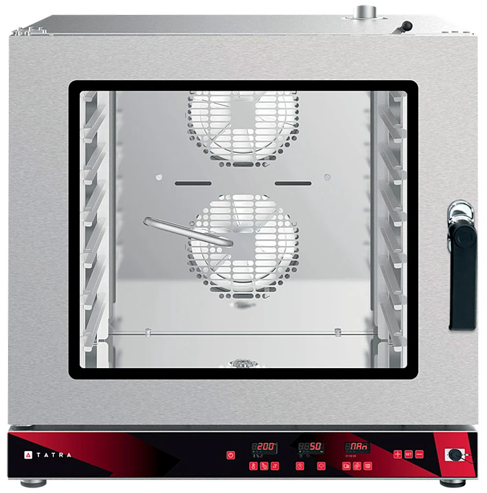Пароконвектомат Tatra TC07D2CL предназначен для использования на предприятиях общественного питания для приготовления различных блюд с применением режимов сочетания конвекции и пара. Фактически пароконвектомат может заменить собой несколько типов теплового оборудования, таких как конвекционная печь, жарочный шкаф, пароварка, плита и сковорода.