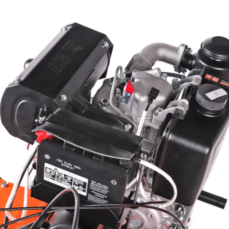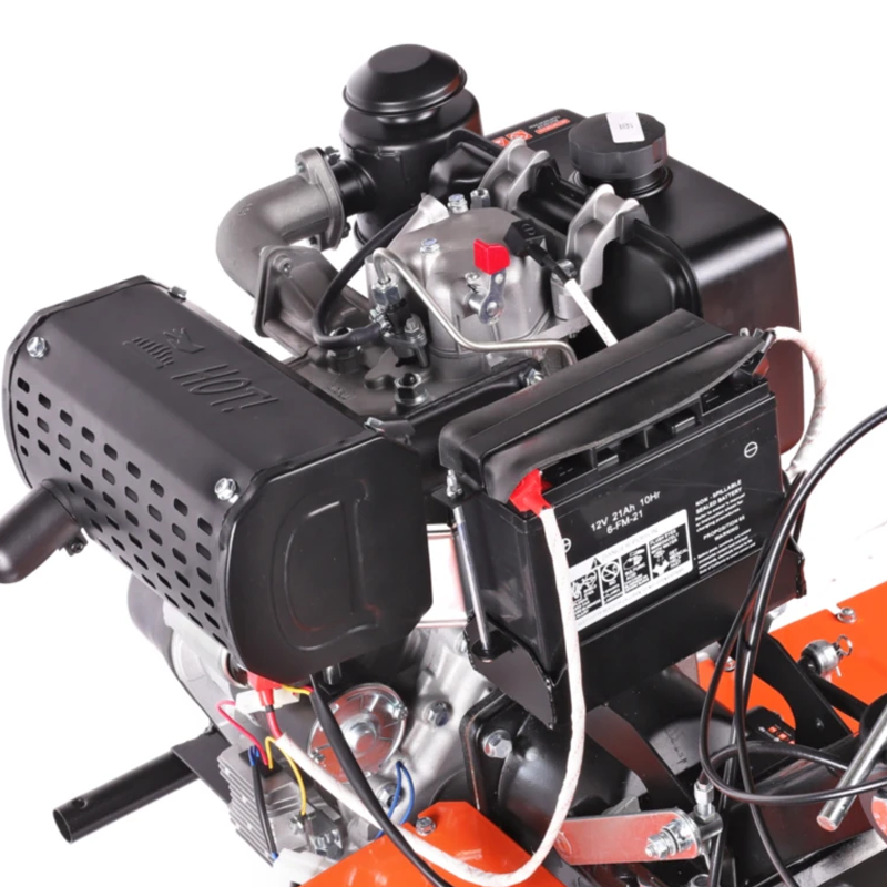 Два вида старта: ручной и электро, с аккумулятором 12В для легкого запуска. Чугунный шестеренчатый редуктор и дисковый механизм сцепления обеспечивают надежность и точность передачи, выдерживая большие нагрузки. Две передачи вперед и одна назад, а также укрепленные металлические фрезы позволяют эффективно работать на тяжелой почве.