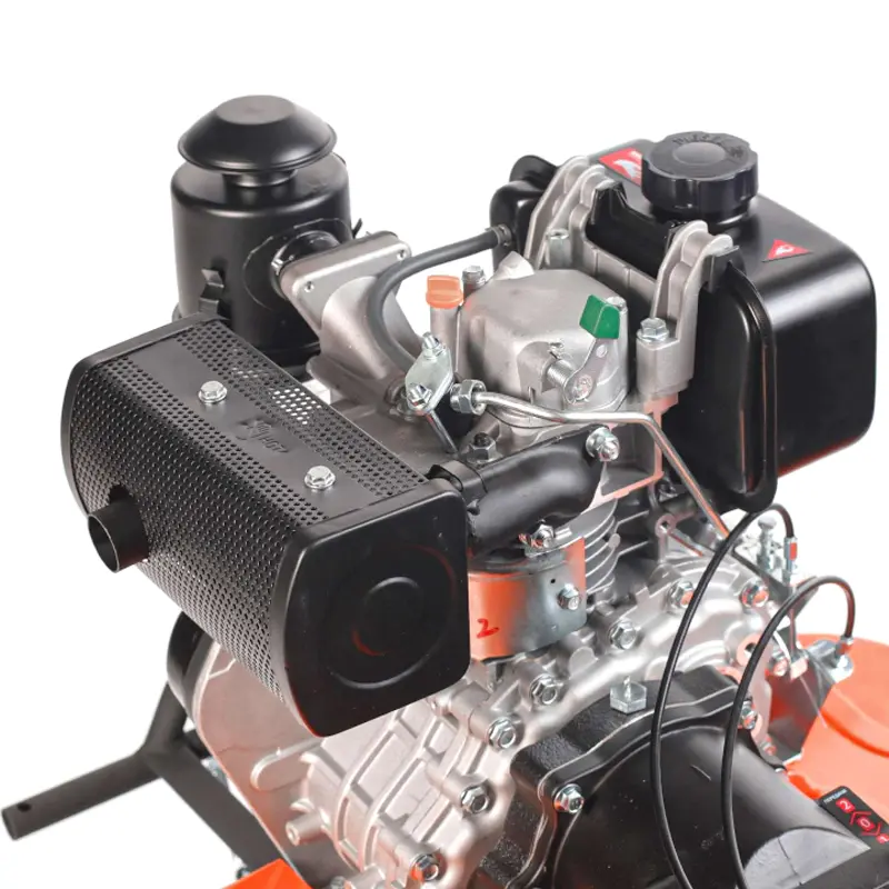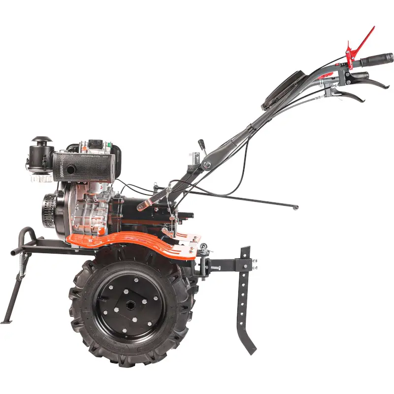 Для облегченного перемещения дизельного мотоплуга по участку предусмотрено 2 скорости вперед, а также одна назад. Задний ход придает агрегату маневренности. Это позволяет быстро разворачивать культиватор в узких местах, парковать, а также аккуратно извлекать из земли фрезы. Для необходимого темпа культивации можно настроить обороты двигателя. Для этого используется рычаг газа.