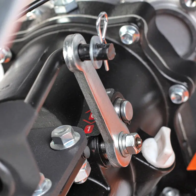 Благодаря валу отбору мощности вы можете использовать активное навесное оборудование, например роторную газонокосилку. Глубина обработки настраивается положением сошника. Для его установки на определенной высоте есть специальные отверстия.