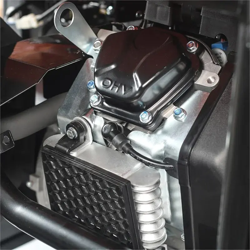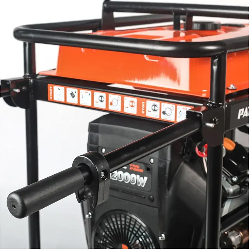 Прочная стальная рама надежно защищает двигатель и электронику от механических повреждений. А благодаря наличию специальных демпферов, которые гасят вибрацию при работе, мотор и внутренние узлы аппарата будут меньше изнашиваться. У генератора имеются колеса для транспортировки. Это помогает без труда перевозить аппарат с места на место.