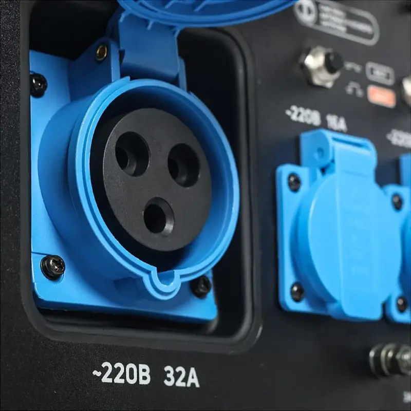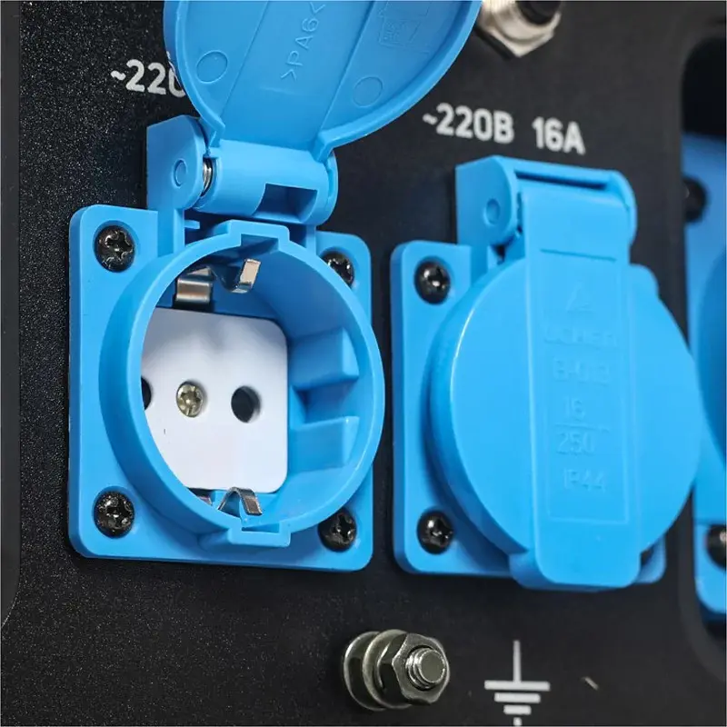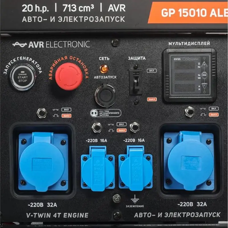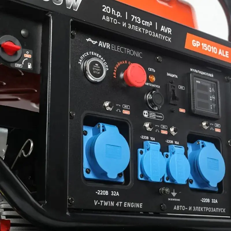 Запуск мотора происходит с помощью электростартера. Принцип действия предельно прост - нужно только нажать на кнопку “Start/Stop”. У модели есть 4 розетки: 2 силовые на 32 А и 2 стандарта “Евро” на 16 А. У каждой имеется автомат защиты. Это позволит обезопасить их от возможного повреждения в случае высокой силы тока, или при возникновении короткого замыкания.