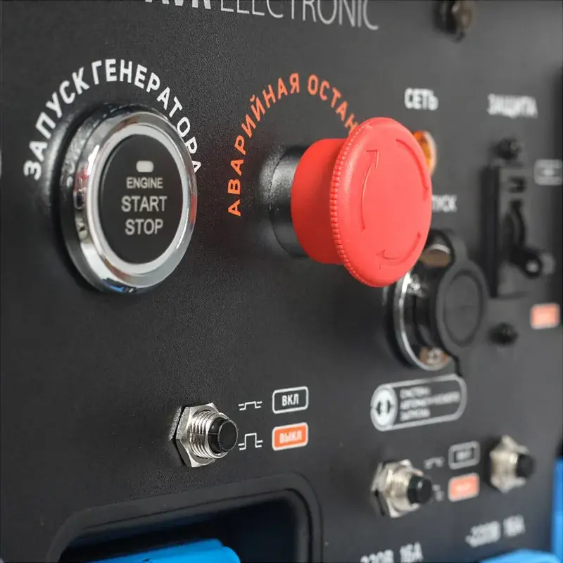 Запуск мотора происходит с помощью электростартера. Принцип действия предельно прост - нужно только нажать на кнопку “Start/Stop”. У модели есть 4 розетки: 2 силовые на 32 А и 2 стандарта “Евро” на 16 А. У каждой имеется автомат защиты. Это позволит обезопасить их от возможного повреждения в случае высокой силы тока, или при возникновении короткого замыкания.