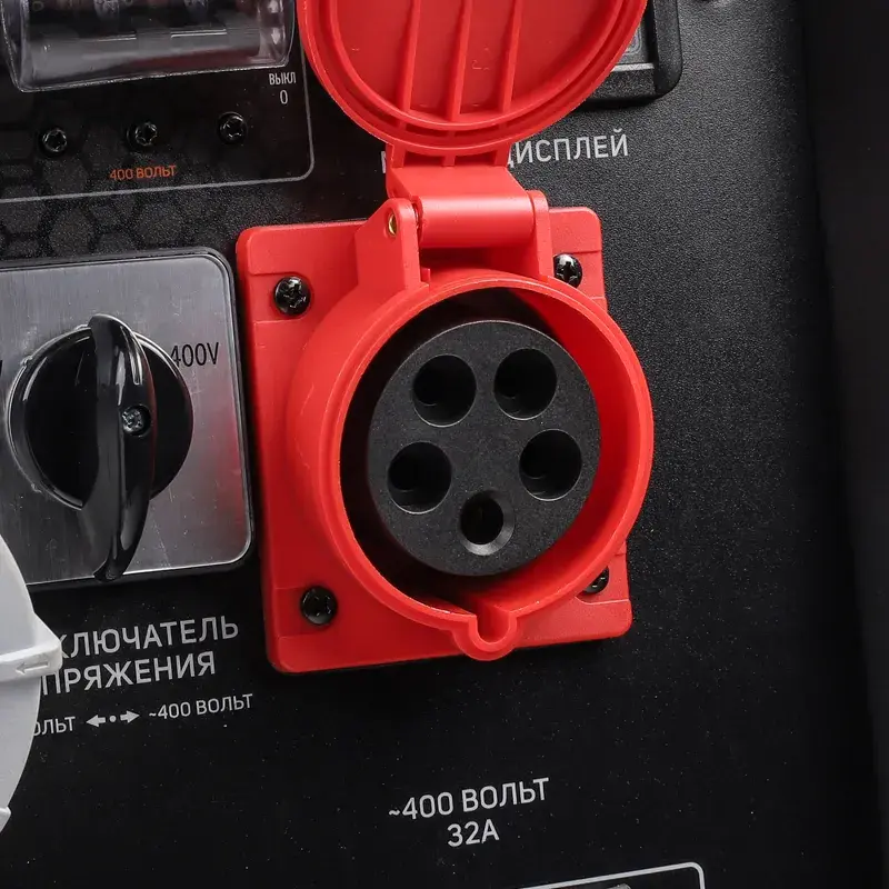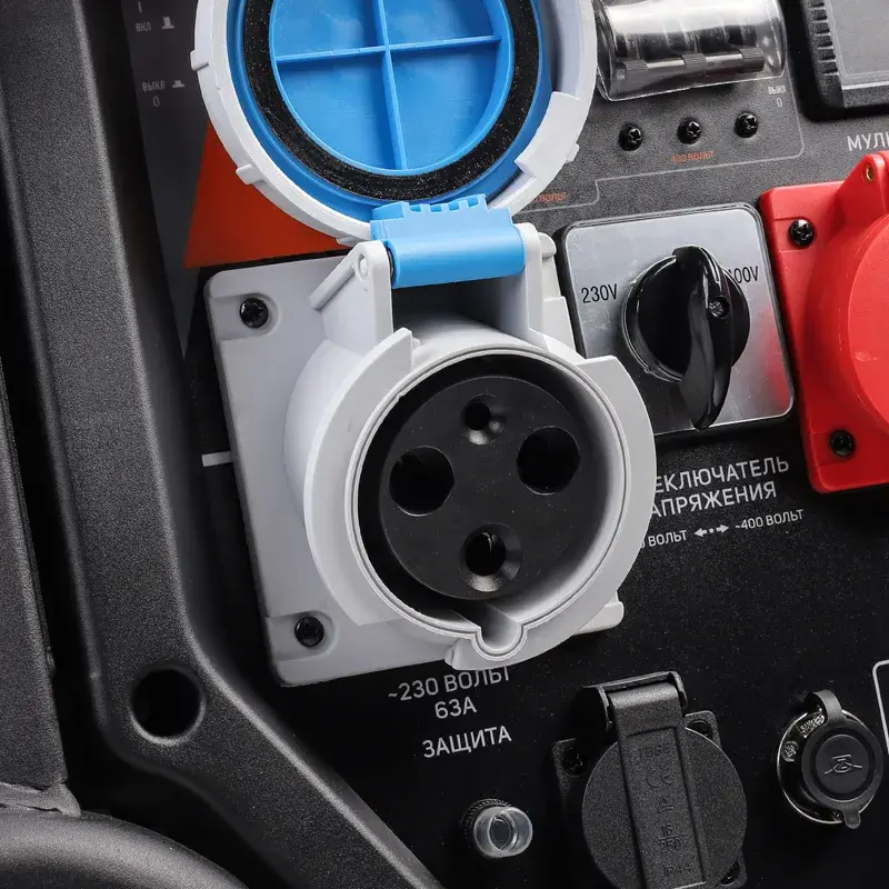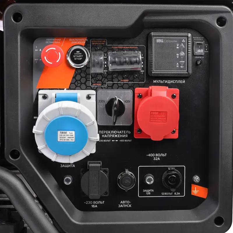 Переключатель напряжения позволяет выбирать режим снабжения однофазным или трехфазным током. На многофункциональном дисплее отображаются значения силы тока, напряжения, мощности, частоты, уровня заряда батареи, отработанных часов.